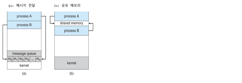 메시지 전달 모델 : 커널 메모리 영역에 메시지 전달을 위한 채널을 만들어서 협력하는 프로세스들 사이에 메시지 형태로 정보를 Send/receive하는 방법이다. 커널을 경유하여 메시지를 송/수신자끼리 주고 받으며, 커널에서는 데이터를 버퍼링한다. 예를 들어, A프로세스가 커널로 메시지를 보내면 커널이 B에게 메시지를 보내주는 방식이다. 프로세스간 메모리 공유 없이 동작이 가능하다. 커널에서 데이터의 주고 받는 것을 컨트롤할 수 있어 별도의 동기화 로직이 없어도 되지만 커널의 통해서 데이터를 주고 받기 때문에 shared memory 모델보다 느리다.