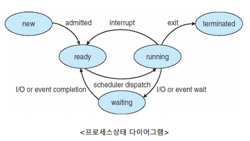 New : 프로세스가 생성되는 중인 상태 / Running : 명령어가 실행중인 상태 / Waiting : 프로세스가 어떤 사건이 일어나기를 기다리고 있는 상태 / Ready: 프로세스가 처리기가 할당되기를 기다리고 있는 상태 / Terminated : 프로세스가 실행을 완료한 상태 -> 프로세스 상태는 계속 변함