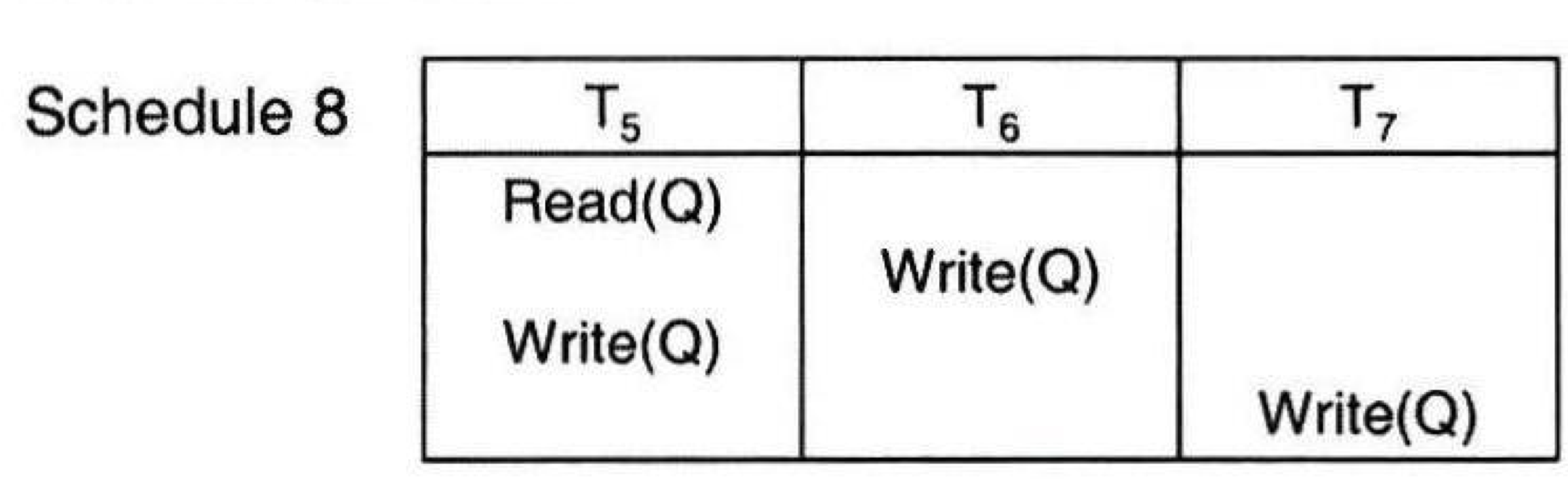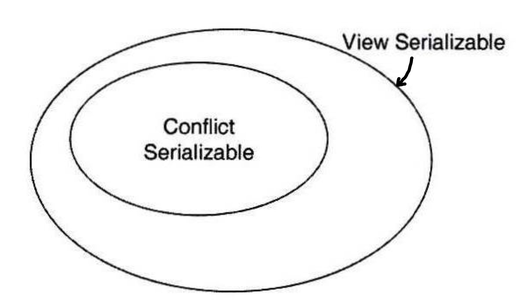 뷰 직렬가능 스케쥴: 스케쥴 S에 속한 각 트랜잭션의 읽기 연산에 대하여 S' 스케쥴에서 동일한 값을 읽고, 스케쥴 S의 마지막 쓰기 연산이 S' 스케쥴의 마지막 쓰기 연산과 동일할 때, 스케쥴 S'은 뷰 직렬가능 스케쥴이라고 한다.