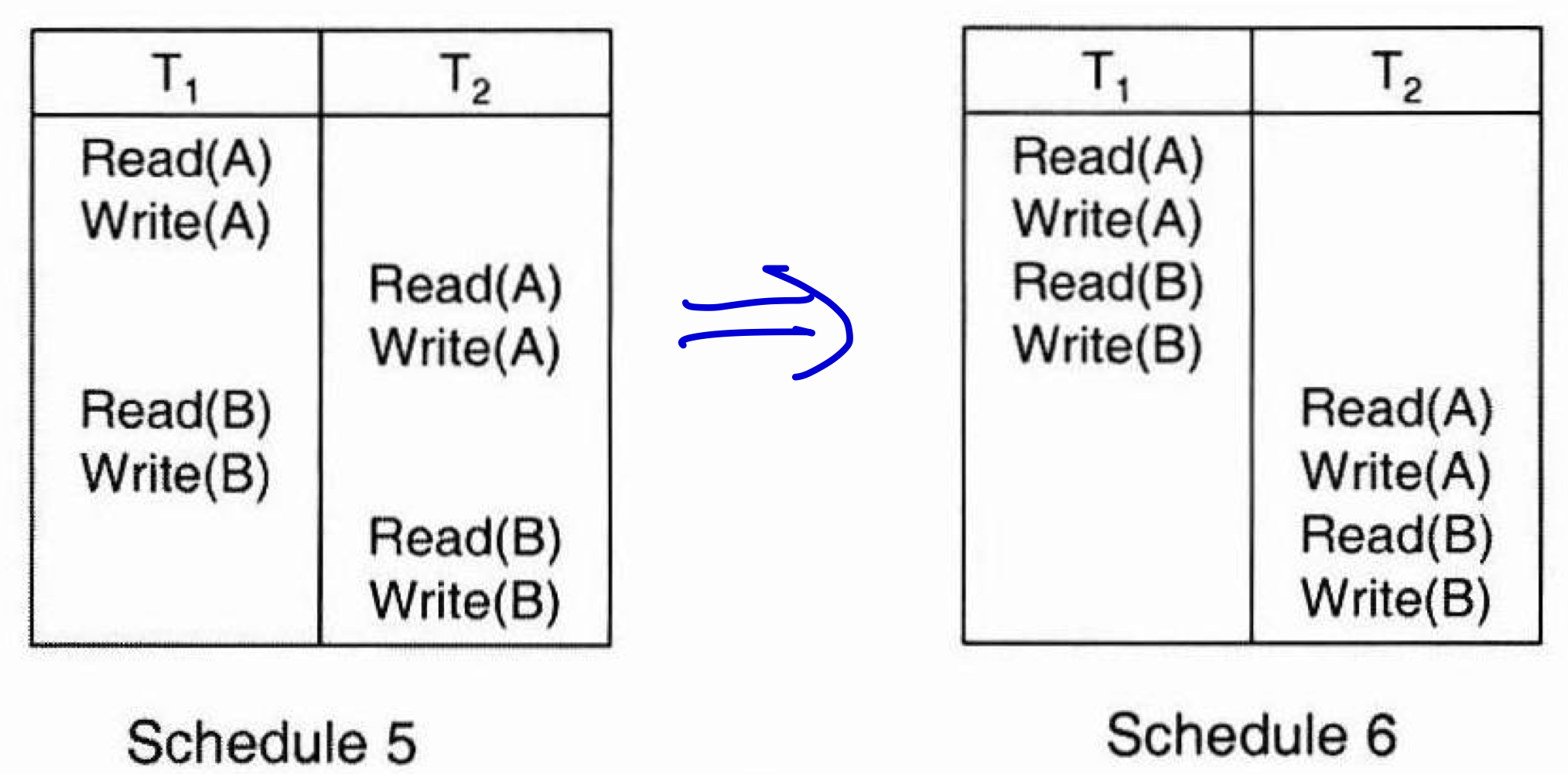 - 직렬 스케쥴: 트랜잭션의 연산을 모두 순차적으로 실행하는 유형으로 하나의 트랜잭션이 실행되면 해당 트랜잭션이 완료되어야 다른 트랜잭션이 실행될 수 있다.