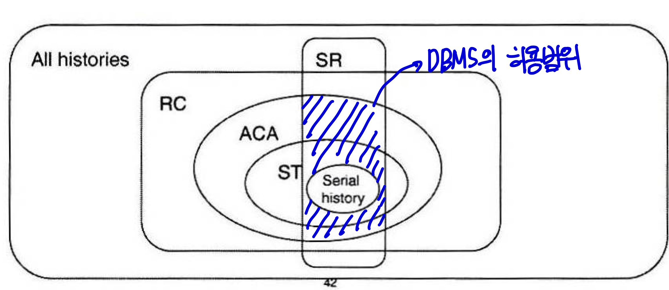 -> 만약 n가지의 트랜잭션이 있다면 총 n!가지의 직렬 스케쥴이 가능하고 이때 직렬 가능 스케쥴은 n!가지 중 적어도 하나의 직렬 스케쥴과 동일한 결과를 가져야 함.