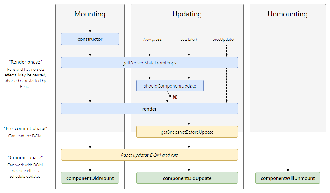 -> getDerivedStateFromProps -> shouldComponentUpdate(true 반환 시 render 호출 / false 시 작업 취소) -> render -> getSnapshotBeforeUpdate -> componentDidUpdate