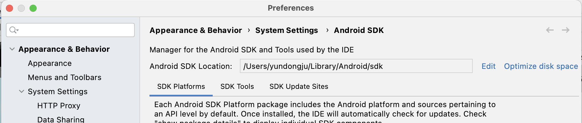 export ANDROID_HOME=/Users/yundongju/Library/Android/sdk //<--이건 본인 Android Studio에서 SDK Manager 들어가면 다음 사진과 같은게 있다. 그거 가져온다.