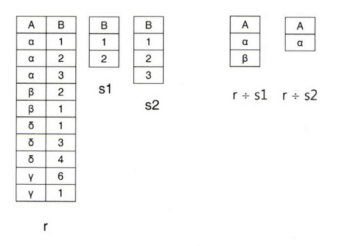 이때, R(A,B,C,D,E) ÷ S(D,E,F)와 같이